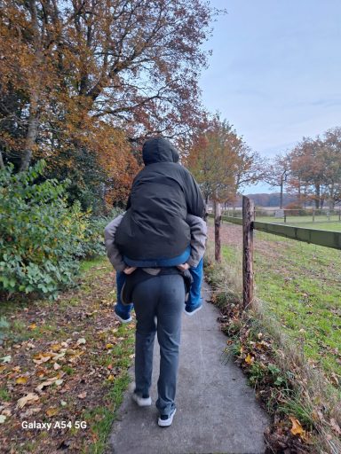 Kom op! grote broer, rondje pad op je rug. want ik ben nog maar een lief klein broertje. Ook als ben ik een paar centimeter groter.