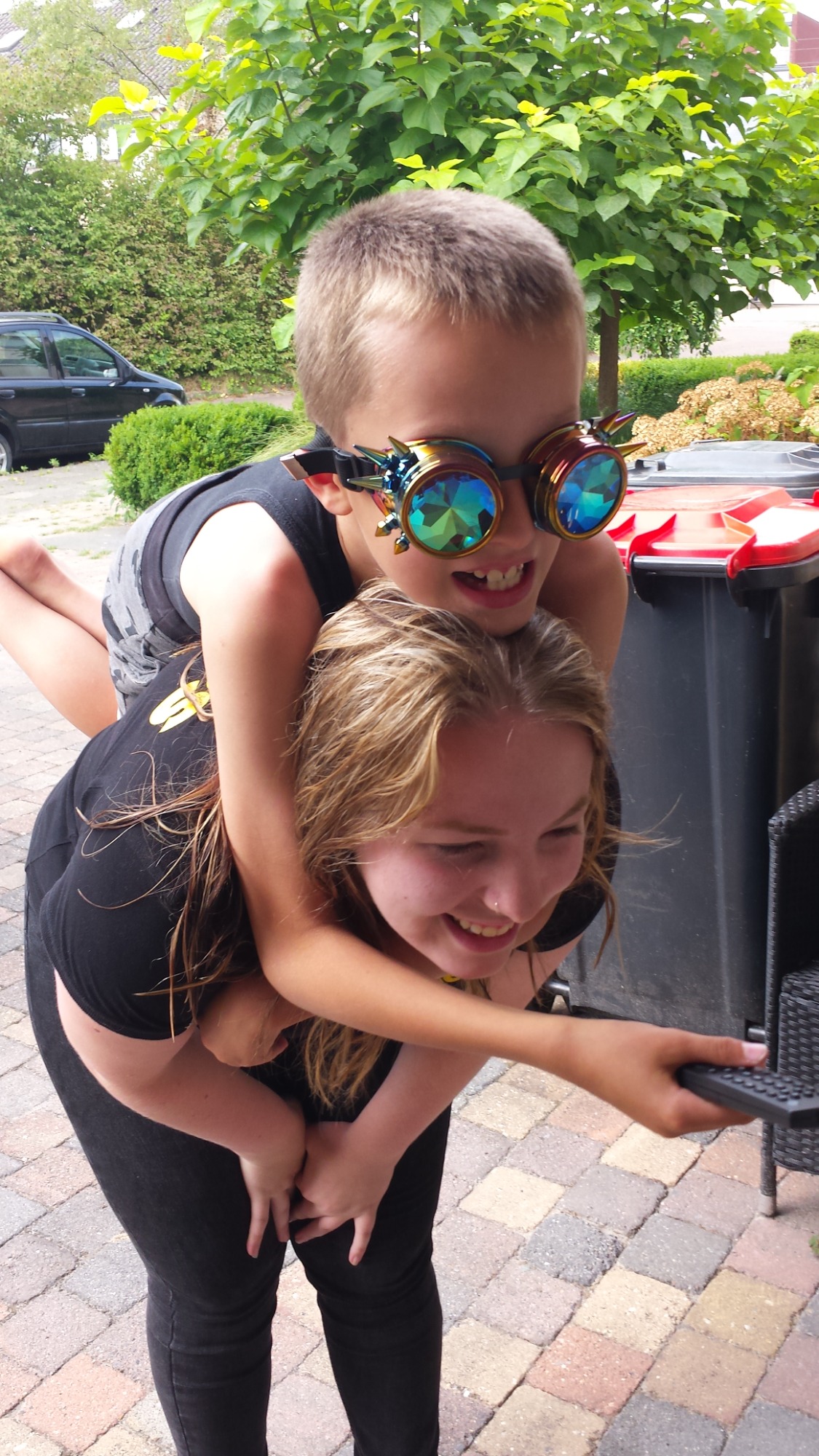 Mijn dag kan niet stuk, op de rug van mijn grote zus gaat ze hop paardje hop over de oprit. Ik kan haar zelfs sturen naar mijn tv-tje.